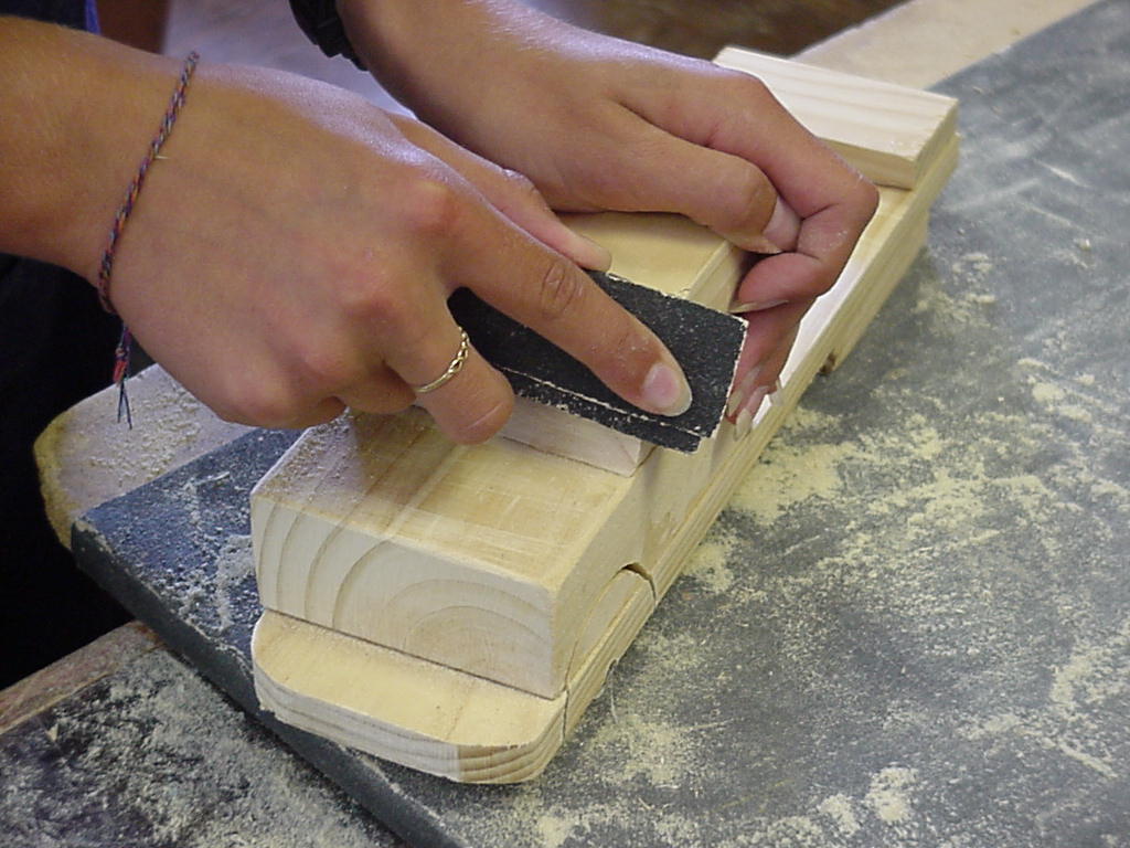 | 10) Assembly of tipper sides & ends at another workstation. | 11) Drilling the hole which represents the cabin window. | 12) Workstation where cabin & chasis are sanded smooth. |