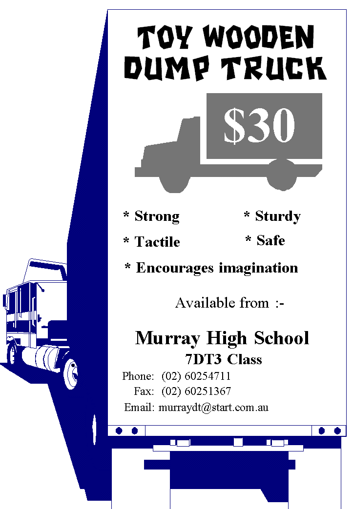 | 13) Workstation where tipper is attached to chasis. | 14) A completed Dump Truck coming off the assembly line after application of polyurethane finish. | 15) Marketing promotion. A desktop published advertising flyer for letter box drop & community market distribution. |