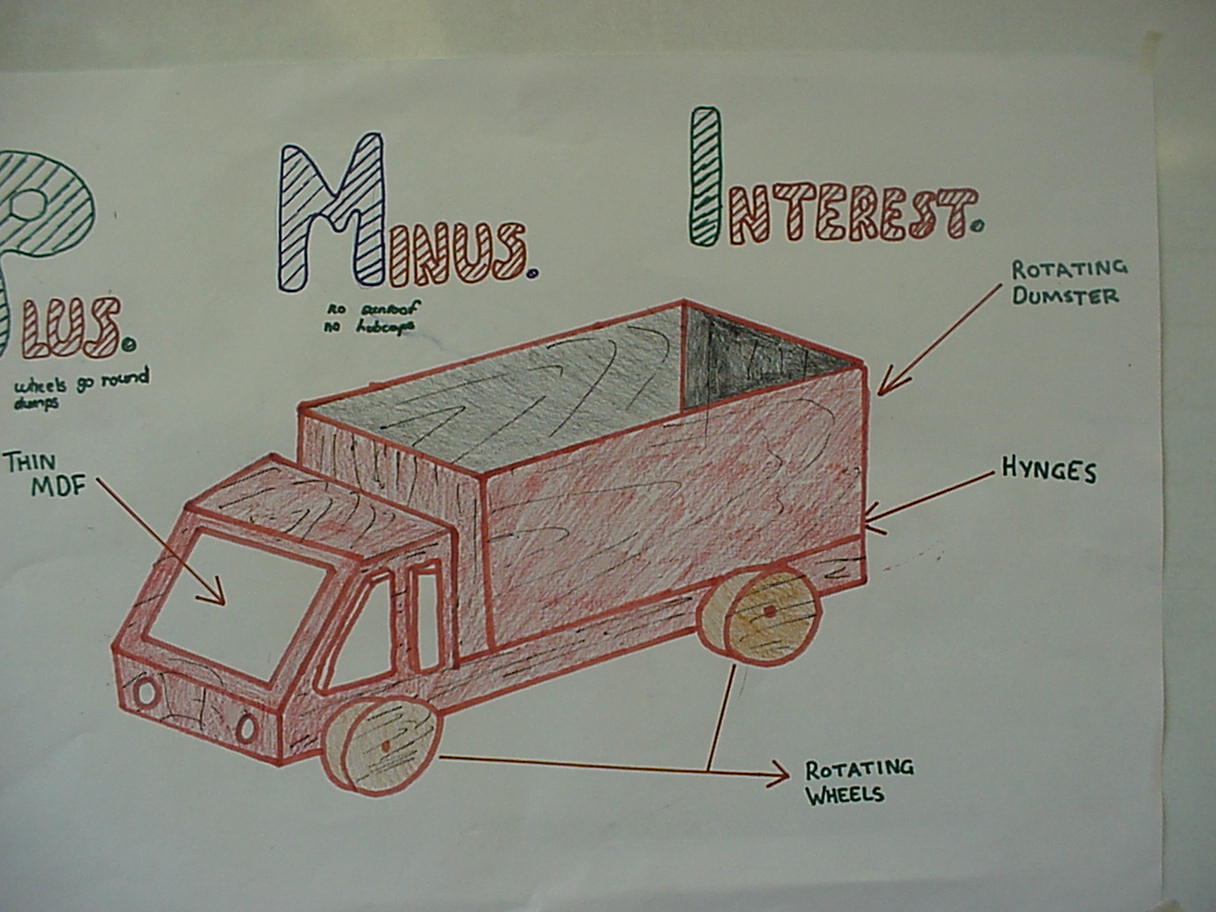 3) Sketch of Group #1's final design idea of Dump Truck with a brief PMI evaluation. |